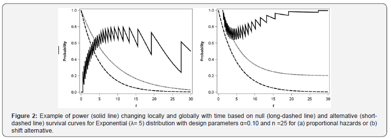 We know that based on the results pertaining to the Type I error provided above, the statistical power of a given test will fluctuate across values of t because the actual due Type I error rate is equal to the desired Type I error rate; we denote these as “local” fluctuations in power. There is also a “global” consideration of power across all choices of t that provide exact alpha level tests. Under our proportional hazards alternative as per (2.1) the power (1-β) is given straightforward as