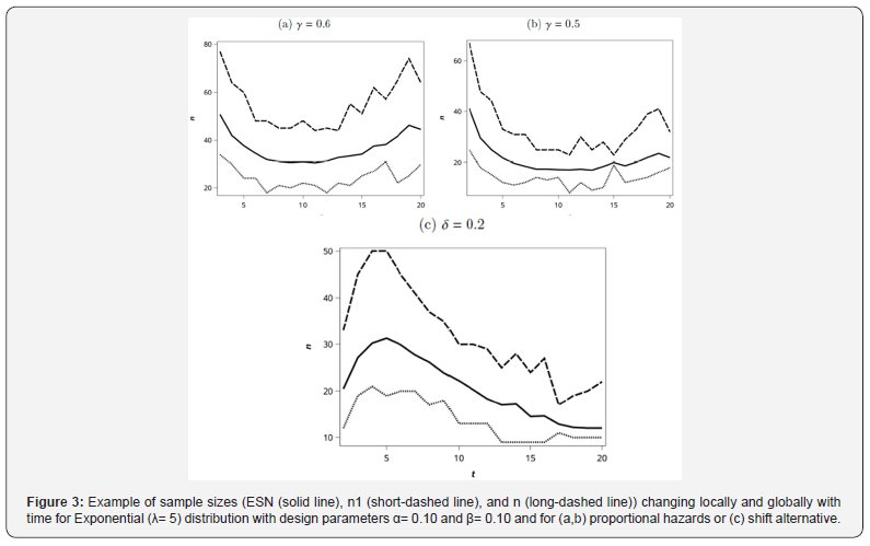 where b denotes the binomial probability density function, and r denotes the number of non-failures in both stages required in order to reject the null hypothesis. The goal is to minimize the ESN at (3.1) while constraining the value of (3.2) to be given S(t) = S0(t) and constraining (3.2) to be ≤α given S(t)=S0(t) under the proportional hazards assumption, or S(t)=S0(t)+ under the shift-alternative as described above. The minimization of the ESN in this design is accomplished via a grid search, e.g., a SAS®_coded version is available [6]. The additional feature relative to our problem is consideration of the size of the study as a function of t: we could (i) minimize the ESN (which is done in the Simon optimal design) as a function of t, (ii) minimize n (which is done in the Simon minimax design) as a function of t, or (iii) minimize n1 as a function of t. The choice of which design parameter to minimize depends our design motivations. Additionally, we could consider restricting the minimization across t to a specific range of interest, say t1<t<t2, e.g., restricting the range to 3 to 12 months. We examine some examples below.