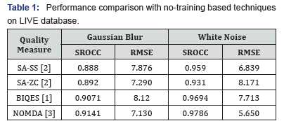 Table 1 presents comparison between all no-reference no-training based technique for white noise and Gaussian blur images respectively. The technique NOMDA [3] clearly outperforms all no-training based techniques such as SA-SS, SA- ZC and BIQES for Gaussian blur and white noise distortions for both evaluation metrics viz. SROCC and RMSE Table 1.