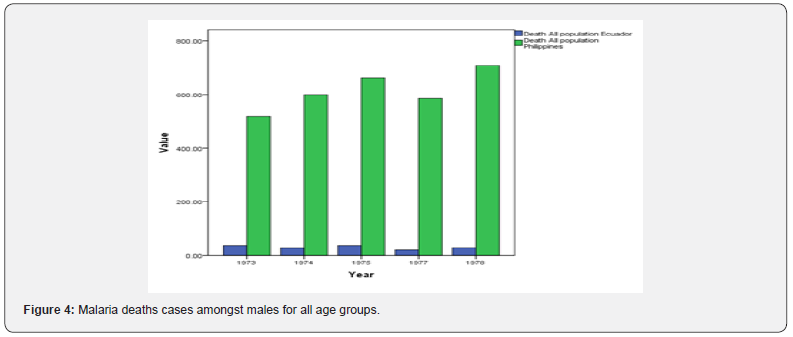The comparative study was clearly restricted to malaria deaths cases reported during the years 1973 to 1975 and 1977 to 1978. During that period, the Philippines reached many cases of deaths due to malaria in all group ages than did the Republic of Ecuador. For further research, we would like to know more about the current status of malaria in these countries, what measures are put in place to eradicate it, and to improve patient treatment.