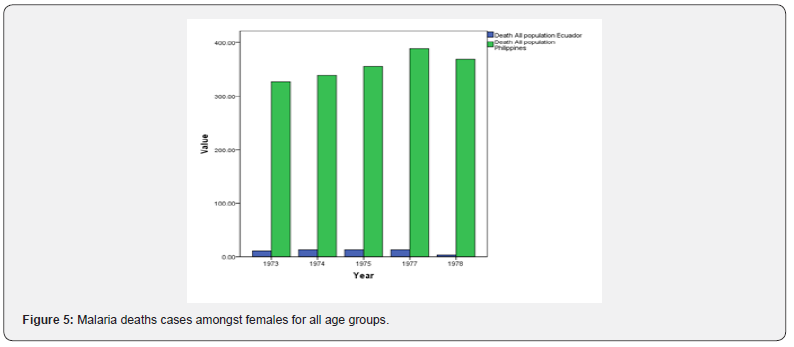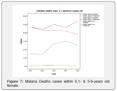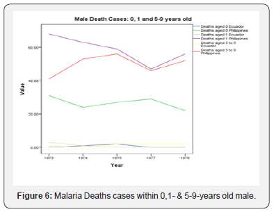 The size area of the Philippines is 300 000 km², greater of about 15 000 km² than the surface area of the Republic of Ecuador. Its population has been about four times that of R. of Ecuador for both males and females in all age groups and years of the study figures 1-3. The Figures 4 & 5 show how higher the deaths cases, respectively for male and female are in the Philippines that in the R. of Ecuador during the study period in all age groups. In considering the size of the population, the mortality rate would still be higher in the Philippines if divide the deaths cases by 4. This is to show that malaria had killed in the Philippines than in the R. of Ecuador during the years 1973 to 1978 excluding 1976. In Figures 5-7, the maximum number of deaths (males & females) in the R. of Ecuador was equal to 3 in 1973 & 1977 while in the Philippines the minimum was 14 in 1974 and were females. Although the highest number of deaths cases was amongst children aged 1 in both two countries, males in all groups died more than did females in over the same period in the Philippines. In addition, in 1977, Philippines’ males in age groups 1 and 5-9 died almost the same number (about 49). Besides, both males witnessed an increase in deaths case from 1977 to 1978. Malaria over the given period had killed more in the Philippines than in the Republic of Ecuador.