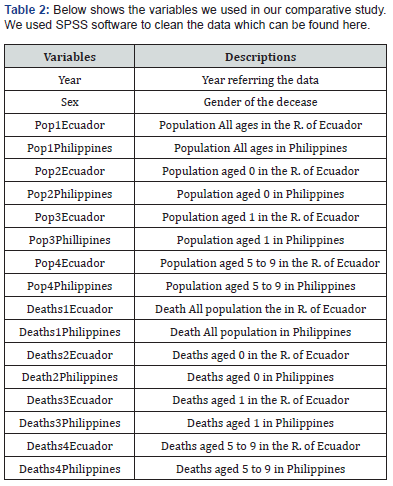 We first get the file named ‘’MortIcd08.zip’’ which represents the mortality data recorded by the World Health Organization (WHO) [2] over a period with a number of records equal to 380,627. To go through this file manually was a tedious task and prone to errors. Therefore, to alleviate our task, we choose SPSS amongst many data managing tools, to perform our analysis. For the consistency of our comparison, we decided to use data from two countries (Philippines and Ecuador) for the following years: 1973, 1974, 1975, 1977 and 1978. The age groups used in this article are 0, 1 and 5 to 9 years old. The procedure to use the recorded data is specified in the ‘’documentation.zip’’ provided by the WHO [2].