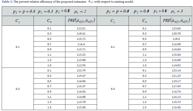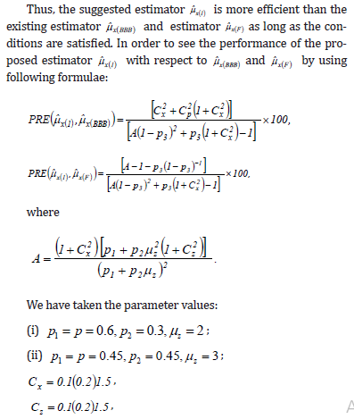 It is further observed from Tables 1 and 2 that the percent relative efficiency of the suggested estimator with respect to existing are larger than 100% for the selected parametric values as given in (Table 1 & 2).