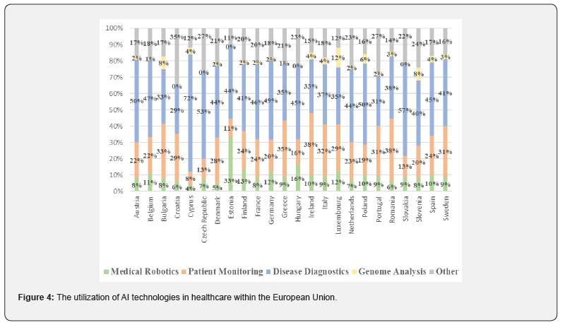 Many European countries have been leading the way in AI research and development, prioritizing patient outcomes while also focusing on cost reduction and enhanced efficiency. In parallel, the European Union has been actively involved in shaping AI policy by creating ethical guidelines and initiating the AI4EU project to drive the rapid growth and acceptance of AI technology across Europe. In Figure 4, it seems that Estonia with 33% leads in the use of medical robotics, Ireland and Romania (38%) have the higher rates in usage of AI technologies for patients monitoring, and Cyprus (72%), Slovakia (57%) and Czech Republic (53%) are at the forefront of using AI for disease diagnosis. Greece has a geographical distribution that includes numerous isolated villages both on the mainland and the islands, leading to challenges in providing healthcare to residents. Additionally, due to the shortage of digital data such as integrations to the Electronic Health Record (EHR), starting any project will require building from the ground up and potentially developing AI systems that prioritize data quality over quantity. This will be based on a dataset that is scalable, customizable, and governable. Healthcare expenditures are not increasing at the same rate as revenue. Additionally, many research studies indicate that primary care is not functioning efficiently, leading to significant issues in hospital emergency departments and resulting in longer wait times and reduced quality of patient care [87,88].