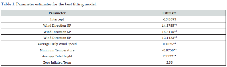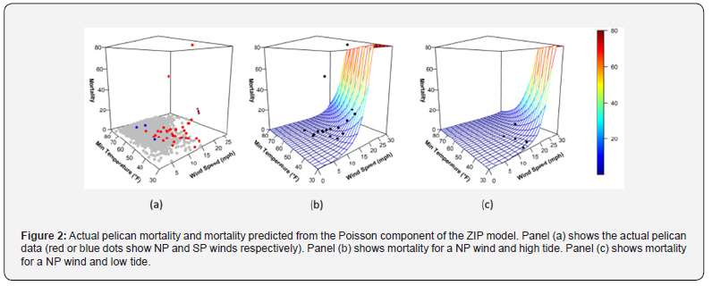 The research team then consolidated the indirect (environmental) and direct (mortality) variables into a single data matrix containing information for each day of the study period, irrespective of whether mortality events occurred. The candidate indirect variables used in the modeling were: Average Daily Wind Direction, Average Daily Wind Speed, Minimum Temperature, Average Tidal Water Level. The direct variables were daily pelican mortalities. Normally, counts such as the daily pelican mortality data would be modeled using a Poisson regression model. Poisson regression assumes that the logarithm of a Poisson distributed response variable (mortality), can be modeled by a linear combination of unknown parameters and indirect variables (i.e., weather variables). However, the pelican mortality data (Figure 1(c)) is characterized by infrequent mortality events. The data is therefore over dispersed or zero-inflated, i.e., dominated by a large number of days with no observed mortality. To account for this over dispersion, a Zero-Inflated Poisson model (ZIP) was used. ZIP regression is used in cases where count data has an excess of zero counts, and where it is reasonable to believe those excess zeros are generated by a separate process from the count values and can be modeled independently. For example, it is possible that many of the days with zero mortality can be explained by the fact that no pelicans (or an insufficient number) crossed the bridge on that day, or that they crossed the bridge using a different flight altitude, or flight behavior. Whatever the explanation for the process, the Poisson component of the ZIP assesses the degree to which weather variables influence the number of birds killed conditional on a mortality event taking place on that day. To understand the impact of different variables on pelican mortality, we used Akaike’s information criterion (AIC) to select the environmental variables that provided the most parsimonious predictions of mortality (i.e., the goodness of fit of the model to data balanced by the number of explanatory variables/parameters).