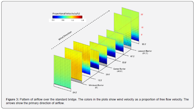 Both methods suggest that the windward CTB influences airflow over the bridge. The CTB creates an upward deflection of the input airstream. At altitudes higher than 15 ft (above the road), airflow over the first two lanes has high velocity (1.2 times the input velocity) and a major upward component. The maximum height of this layer of fast-moving air occurs close to halfway across the bridge. Over the leeward lanes, the air begins to slow down, and has a strong downward component. Behind the windward CTB, a large vortex forms (slow-spinning air), and between the vortex and the upward layer of fast areas, a few other layers form with speeds intermediate to the fast layer above and the slower layer below. Some of these layers have enough velocity to cause a secondary but relatively minor vortex behind the median CTB. At the leeward side of the bridge, the air has decelerated such that the leeward CTB has little effect on airflow. These patterns of airflow were similar for both causeway and bridge sections of the road. The main differences between these two cases are the presence of slopes on the windward side of the causeway (instead of airspace under the bridge model); and the lack of a leeward CTB on the causeway. Figure 4 shows CFD generated airflow patterns simulated over the bridge model, with a 15 and 30 degrees wind. As the wind angle becomes more oblique, the height of deflected air is lower, and its velocity also decreases (as does the size of the vortex behind the median CTB).