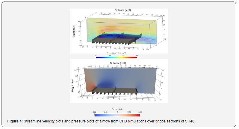 Figure 3 shows the airflow over the bridge scale model as measured in the wind tunnel experiments. In this figure, the panels are arranged as cross-sections of the roadway. Each panel coincides with the locations at which a electronic probe took velocity and pressure measurements. The panels are colored to show the velocity at a location proportional to the input velocity (green areas indicate no difference between input velocity and a measured location, blue areas show local air moving slower than the input wind, and yellow to red colors show higher local velocities than the input speed). Figure 4 shows an analogous view of airflow over the bridge using CFD results. As in the case of wind tunnel outputs, the plots show local velocity proportional to the input airflow. To a large extent, the airflow patterns from the CFD and Wind Tunnel matched qualitatively, but a lack of fully quantitative data from the wind tunnel prevented the research team from performing a more thorough validation.