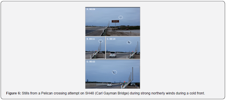 Schnell and Hellack [3] estimated the air speeds of pelicans engaged in horizontal flight to be between 17 and 35 mph, depending on the strength and direction of the wind under which measurements were made (Table 2). Hainsworth [4] also studied pelican flight and estimated that pelicans, flying low to the water (at a typical low flying altitude of 13 inches), require 49% less energy than birds flying at higher altitudes because of the ground effect. Figure 5 shows a series of stills taken from video recordings of pelicans attempting to fly across the Carl Gayman Bridge during a cold front, with sustained wind speeds and gusts of approximately 35 and 45 mph respectively (December 2016). In the last frame of these stills, the pelican abandons the crossing attempt by turning into the wind, and flying back toward the ship Channel. Using stills from this and other attempted crossing, we estimated the ground speed of birds to be between 1 and 5 mph (1.67 mph in this example) or an air speed of between 42 and 47 mph (assuming a 40 to 45 mph prevailing winds).