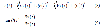 Speeds and accelerations are calculated separately into longitudinal and lateral directions. It was chosen to define vehicles orientations by using the polar coordinates system (r,θ). The following equations represent the magnitude of the traveled distance (r) by a specific object between two successive frames in unit time (t), and its inclination angle (θ) with y-axis, Equation 8, and Equation 9.