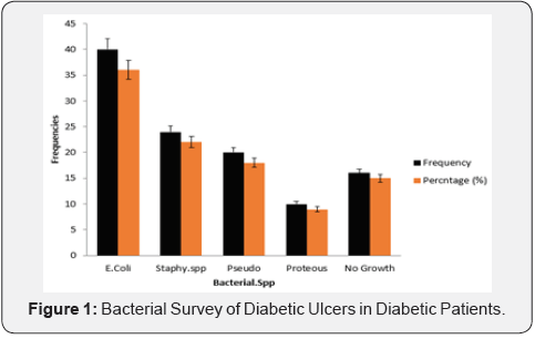 In conclusion, our bacterial survey of diabetic ulcers in diabetic patients revealed that the most predominant bacterial in diabetic ulcers in our center is Escherichia coli (E. coli) followed by Staphylococcus spp. Therefore, the knowledge of this bacterial survey will be useful in management of diabetic ulcers.