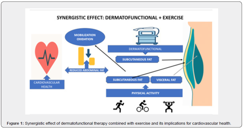 When dermatofunctional therapies are combined with exercise, their effects become complementary. Dermatofunctional interventions induce local lipolysis and mobilization of fatty acids from the subcutaneous compartment. Exercise performed immediately after the session provides the necessary metabolic demand for these fatty acids to be transported to skeletal muscle and oxidized in mitochondria, preventing re-esterification and ensuring effective fat utilization. This synergy not only optimizes aesthetic results but also amplifies systemic benefits: enhanced lipid oxidation reduces ectopic fat deposition, improves cardiometabolic profile, and contributes to lowering cardiovascular morbidity [6-9] (Figure 1). Clinical studies support this rationale: the combination of radiofrequency or shockwave therapy with aerobic exercise has been shown to produce greater reductions in abdominal subcutaneous fat compared to exercise alone [12]. Similarly, radiofrequency followed by moderate aerobic exercise led to superior decreases in waist circumference and adipose tissue thickness compared to sham protocols [13].