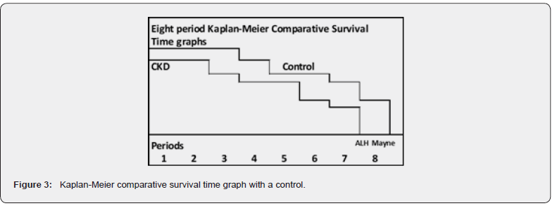 Kaplan – Meier survival statistics (K-M) involves the survival of a cohort from a common start to the death or removal of the final subject (Etikan, et.al., 20174; Goel, 20105) [12,13]. Unlike Schwartz’s continuous curve in Figure 2, the K-M curve has a discontinuous form with downward steps for the death or removal of one or more participants from a study for the disease cohort, and the control group. This may also include a graph for the cross-comparison of a different chronic disease such as Alzheimer’s dementia or non-Hodgkin lymphoma listed in Table 2. Figure 3 simulates a survival time of 7 periods for CKD and 8 periods for the control. There are 5 downward censoring steps of differing height for one or more removals of patients for CKD and the control. CKD in this example, has a lower survival time than the control, and indicates that medical intervention in the case of CKD may be necessary. The control may be a healthy person or another chronic disease such as non-Hodgkin lymphoma.