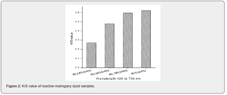 The co-efficient reflection of all dyed samples for the wavelength of 400 to 700nm was observed. K/S value represents the characteristics of dyed samples and it is a straightforward way to decide a color as a concentration. It is a single numerical value based on spectral data which represents the quantity of light absorbing substance (Figure 2). The K/S values of reactivemahogany dyed samples, R0.25%-M10%, R0.50%-M10%, R0.75%-M10% and R1%-M10%, were presented at (Figure 3).