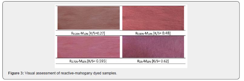 Therefore, a* values of resulted samples R0.25%-M10%, R0.50%-M10%, R0.75%-M10% and R1%-M10% indicated inclination towards reddish color which was supposed to be happened. Whither, the difference of b* values was negligible as reactive red color was applied for reactive dyeing. Then b* values of resulted samples R0.25%-M10%, R0.50%-M10%, R0.75%-M10% and R1%-M10%were increased gradually from those of standard samples R0.25%, R0.50%, R0.75% and R1%. So, b* values of all reactive-mahogany samples referred to yellowish color. Above the CIE value, an authentic color combination/improving new shade may be offered by reactive-mahogany dyeing. From the discussion it can be concluded that reactive dyeing and mahogany dyeing occurred at an independent mode on cotton, where the auxiliaries of reactive dye worked for the reactive dyeing and at the same time mahogany dye did not create any obstacle for reactive dyeing. Thus, the compatibility of the dyes is ensured. The visual evaluation is imperative to assess the dyed samples and enhancing properties from a common consumer’s point of view. Visual assessment of dyed samples especially reactive-mahogany and only mahogany samples was given below (Figure 3).