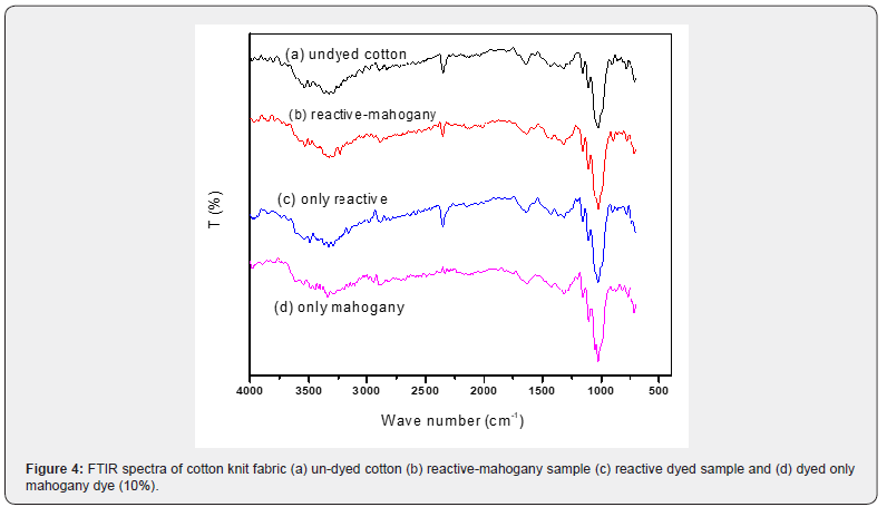 With regard to cotton fabric, the FTIR transmission spectra could say the distinction of 04 (four) samples such as- un-dyed cotton, reactive-mahogany shade sample, only reactive shade sample and only mahogany dyed sample due to estimate almost the chemical structure of fiber [32-35].