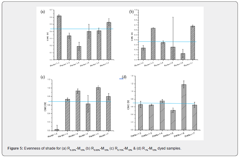 (Figure 5) demonstrates the comparative CMC DE values where some random check points were selected for investigating the color differences of reactive-mahogany dyed samples [R0.25%-M10%, R0.50%-M10%, R0.75%-M10% and R1%-M10% respectively]. All the dyed samples exhibited CMC DE values within compatible ranges that affirm the evenness of shade. It was previously mentioned that there are huge triterpenoids of luminoid class in mahogany leaf extract that is able to form glycoside linkage with glucose of cotton cellulose. For even shade it is important that sufficient functional groups should be there also in cotton fiber. But conventionally, basically for reactive dye, alkali medium is formed by the active hydroxyl ion provided by sodium carbonate. Most probably within the huge alcoholic content, there might be some active hydroxyl group that could initiate the formation of cellulosate ion, and then uniform distribution of fiber-dye bonding is thought to be happened.