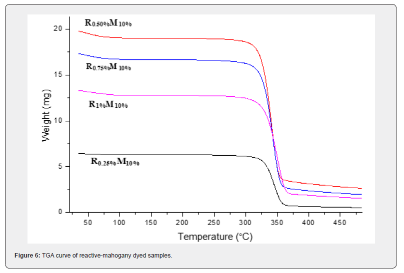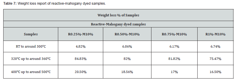 As evident from (Figure 6), the onset temperature (of degradation) was found to improve within the case of sample R0.25%-M10%, R0.50%-M10%, R0.75%-M10% and R1%-M10% of reactivemahogany dye. This can be due to the protective effect of different shade percentage of reactive dyes with mahogany 10% shade. (Table 7) The weight loss within the to begin with step compares to the evaporation of bound water. This procedure was made a wide endothermic peak and ends at around 300oC. Therefore, a preliminary weight coming about from moisture departing was showed up beginning from room temperature up to around 300oC. The weight loss% of all dyed samples were mostly similar up to around 300oC, in any case the weight loss% at 350oC were exceptionally diverse. The weight loss of sample R0.25%-M10%, R0.50%-M10%, R0.75%-M10% and R1%-M10% were respectively 4.82%, 6.06%, 6.17% and 6.74%. Reactive-mahogany samples (from room temperature to around 300oC) were loss their weight gradually by the rising of temperature and reactive dye% was also increased where mahogany dye was stationary.