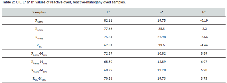 Data color 650 Spectrophotometer was used to estimate the CIE value of different samples which were dyed with reactive and mahogany leaf extract dye. Reactive samples were considered as standard, besides the CIE L* a* b* values of reactive-mahogany samples were also investigated. (Table 2) was displayed the entire color shade of L*, a*, b* values indicating that higher L* values indicated lighter shade and lower L* values indicated darker shades. Green and blue were represented by negative a*, b* values; whereas red and yellow were represented by positive a*, b* values. So, from this information it was clear that L*values of the resulted samples R0.25%-M10%, R0.50%-M10%, R0.75%-M10% and R1%-M10% (reactive- mahogany dyeing) were decreasing than the L* values of standard samples R0.25%, R0.50%, R0.75% and R1% (reactive dyeing only); where increasing of reactive dye percentages were confirmed. At the same time a* values of resulted samples were also decreased proportionally from those of standard samples.