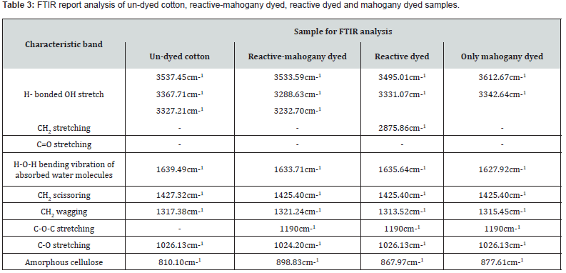 For un-dyed cotton, reactive-mahogany sample, only reactive dyed sample and only mahogany sample; the lowest and height peaks were 698cm-1 and 4000cm-1 respectively. These peaks were unique for identifying the chromophore present in the dyestuff that was responsible for certain colors shades on sample, and they clarified the existence of the color in the observable spectral range (Table 3). As per established theory of only reactive dyed sample the characteristic peak was at 1190-1210cm-1 represent the -C-O-C- stretching for the covalent bond formed with the cellulose ion of cotton and the cationic carbon of triazynyl reactive dye, or the terminal carbon of vinyl sulphone reactive dye [36].