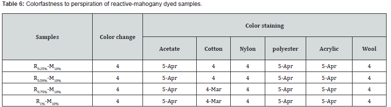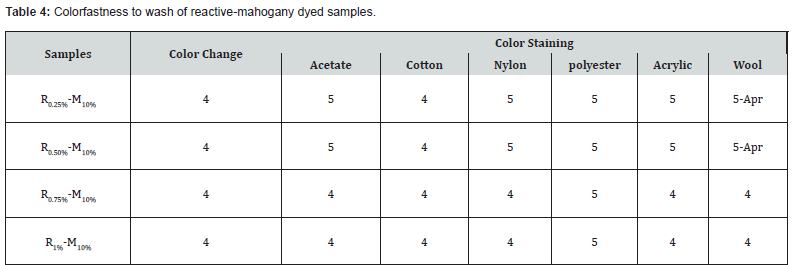 Fastness is the elemental necessity that dyed samples ought to display, to the conditions in which they will undergo during the processes that follow coloring and even during their subsequent utilization. This test was outlined to determine the amount of color transferred from the surface of dyed cotton knit fabric to other surface by rubbing. Best results of color fastness to rub (under wet and dry condition) were obtained (Table 5). The grey scale rating of rubbing fastness was showed 4 & 5 (under wet and dry condition) for both shades such as sample R0.25%-M10%, R0.50%-M10%, R0.75%-M10% and R1%-M10%. Here, 4 and 5 were indicated absolutely good-excellent level too. Samples fastness properties could vary depending both on color strength (K/S) value and fixation percentage. In addition to fastness of dyed samples were also connected to FTIR data because of the peak for the most intense hue reactive- mahogany dye was almost around 1200cm-1 that confirming the bonding of dye with fiber. Basically, triterpenoid reacts with glucose, which had mentioned earlier that improved dye fastness. Due to this region the rubbing fastness of reactivemahogany samples were provided outstanding performance.