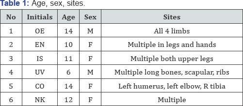 Table 1 on the whole, the patients were aged from 6 to 14 years (mean 11 years). The female/male ratio was 2:1. Multiplicity of sites was striking. The specimens measured 1 cm to3 cm. Incidentally, only two patients were X-Rayed