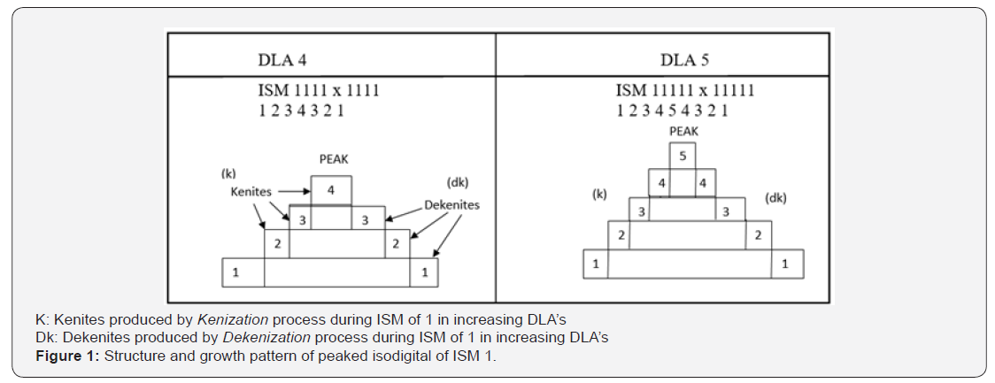 a. Peaked palindromic pre-emptive isodigitals, ref. Chart 1 and Table 3. They are products of Isodigital Square Multiplication (ISM) of digit 1 in increasing DLA indexes evident from DLA 2. The incumbent DLA index (4) of the ISM is the peak(n). The upward slope is worked in serial steps from 1 at the base to peak (n) ie 4 by kenization process of adding 1 successively while the downward slope from peak(n) dekenization process of subtracting 1 successively to 1 at the base again as shown in Figure 1. The serial products of kenization are christened kenites, while those of dekenization are dekenites, as depicted in Figure 1. Kenization (adding 1) and dekenization (subtracting 1) working in concert produce duplicate serial isodigitation in ISM of digit 1 rather ironically in view of their opposing drives (Figure 1).