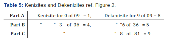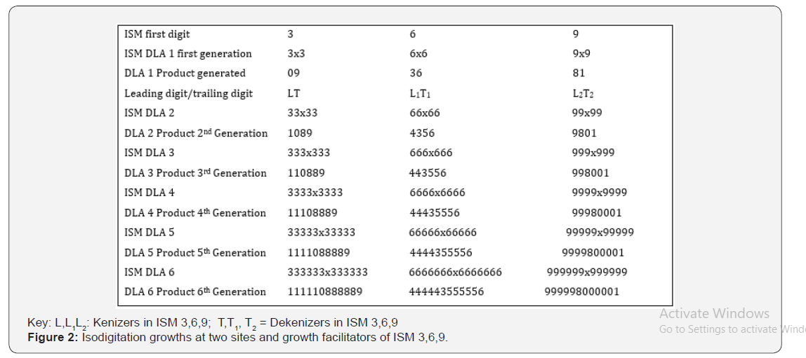 In Figure 2, Part A, at DLA 1 the Isodigital Square Multiplication (ISM) primary digit is 3 and the product 09 is called gamete, where the leading digit 0 is denoted L and the trailing digit 9, T. At DLA 2 the ISM 33 x 33 product 1089 is derived thus: the leading digit 0 of the gamete 09 becomes a kenizer and kenizes itself (adds 1 to itself) to form a kenizite, 1, as depicted in Table 5 and place it in its front, while the trailing digit 9 of the gamete also becomes a dekenizer and dekenizes itself (subtracts 1 from itself) as shown in Table 5 to form a dekenizite, 8, and places it in its front to give altogether 1089 as shown in the ISM 33x33 DLA 2 product. At DLA 3, ISM 333x333 product grows to 110889 from 1089 due to insertion of one additional kenizite 1 in front of 0 and insertion of another additional dekenizite 8 in front of 9 to bring about the isodigitations evident at two sites for the first time. The isodigitations at the two sites continue to grow by one kenizite and one dekenizite with the progression of the DLA index of ISM as shown in the succeeding cases of Part A.
