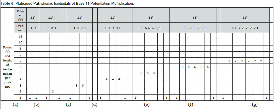 The growth pattern of the isodigitation in this case is based on potentiation index of base 11, whereby the incumbent potentiation power (n) is replicated (n-1) times and sandwiched in 11 to make the product of potentiation multiplication of base 11 at various powers of potentiation. Hence given 14441, the digits I in front and I behind put together laterally give 11, which is known to be the potentiation base 11, and the digit 4 indicates the potentiation power 4 while the isodigitation digitality of 3 for 444 is derived from the power 4 by dekenization ie. subtraction of 1 from 4. In effect the population of the isodigitation consists of the power index (n) replicated (n-1) times and sandwiched in 11 to give the palindromic plateaued isodigital product always as depicted in Figure 2.