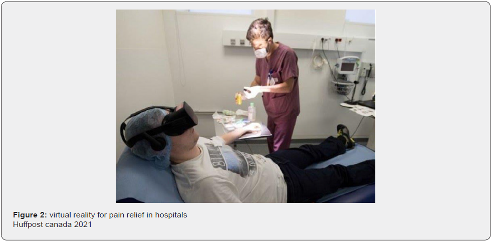 VR is the most useful and used in this area. In developed countries, many oncology departments use virtual reality to help their patients fight against pain related to the disease or following a biopsy. Almost half of hospital patients experience pain, a quarter of which is considered “un-bearable” [4]. The treatment of pain has traditionally been based on pharmacological management, including opioids, which can give inconsistent and suboptimal results. Therapeutic virtual reality (VR) has become an effective and non-pharmacological treatment modality for pain [4,5]. VR users wear a head-mounted display with a proximity screen that creates a feeling of being transported to realistic three-dimensional worlds (Figures 1 & 2).