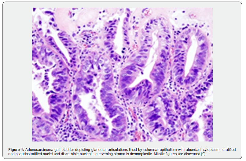 As per the contemporary World Health Organization (WHO) classification, adenocarcinoma gallbladder displays distinct histological variants categorized as ~biliary type adenocarcinoma as a predominant variant encountered in ~75% lesions and is constituted of adenocarcinoma not otherwise specified (NOS), papillary and micro-papillary variants. Akin to pancreatic ductal adenocarcinoma, neoplasm is comprised of tubules layered by cuboidal to columnar epithelial cells. Tubules appear enmeshed within a desmoplastic stroma. Of varied morphology ranging from bland countenance to poorly differentiated neoplasms, moderately differentiated tumours of adenocarcinoma gall bladder are commonly encountered [3,4].