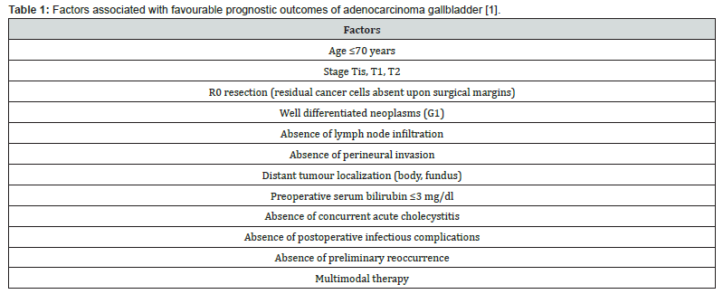Advanced neoplasms may configure a gallbladder mass infiltrating hepatic parenchyma. Ultrasonography emerges as a primary imaging modality for screening possible adenocarcinoma gall bladder. Computerized tomography (CT) may be beneficially adopted to assess anomalous features discerned upon ultrasonography. Magnetic resonance imaging (MRI) may be advantageously employed to obtain detailed information or evaluate specific tumour staging parameters [7,8]. Adenocarcinoma gall bladder may be suitably managed with surgical manoeuvers as cholecystectomy. Aforesaid surgical eradication along with or absence of tumour within cystic duct margin is appropriate in alleviating stage T1a neoplasms.