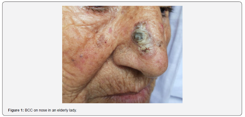 Basal cell carcinomas are common of skin cancers and belong to keratinocyte cancers. The incidence of BCCs is dramatically increasing globally and are the most common cancers among fair-skinned populations worldwide. Australia has the highest incidence. Asian and African origin people are also showing a marked increase in incidence and now BCC is one of the most common types of skin cancer in certain populations such as among individuals of Asian or African origin. BCC is not as common in blacks as in white population [1]. It is the most common cutaneous malignancy of white skinned people and second most common cutaneous malignancy in dark skinned people [2]. The Head and Neck region is the Anatomically favoured site [3,4]. UV radiation has been implicated in development of Skin cancers. UV radiation is the major risk factor for BCC as well as SCC, their anatomical distributions differ. It has been seen that there is a considerable difference in anatomic locations. The Squamous cell carcinoma occurs primarily on sites mostly exposed to sunlight such as the face and exposed parts of the upper and lower limbs, whereas BCC occurs also on these sites and those less frequently exposed to sunlight such as the trunk. Sunbathing increases the risk [5].
