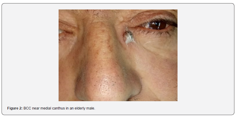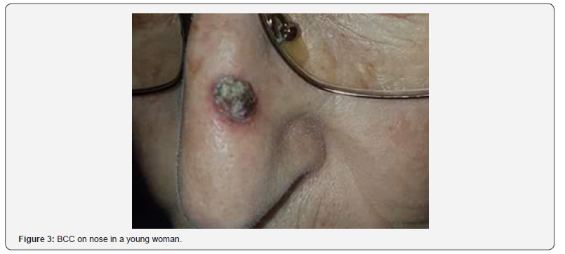 Face, nose, cheek, Nasolabial folds and eyelids are the most common sites followed by Shoulder, back or chest. Malar region and nose are common sites for BCC [6,7]. Superficial BCCs are common on Shoulder, back or chest. BCCs around auricle are also reported. Most cases of BCC are reported from the face. This is followed by cases of BCC on nose or lateral aspect of the nose. The other sites effects are forehead, lips and scalp. Reports of BCC in Back and Axillary region are also reported [8]. BCCS can have varied presentations such as a non-healing ulcer, a pigmented lesion, a crusted lesion or a bleeding ulcer. Xeroderma pigmentosa, Basal Cell Nevus syndrome Rombo syndrome and Bazex Dupre Christol syndrome predispose to BCC.