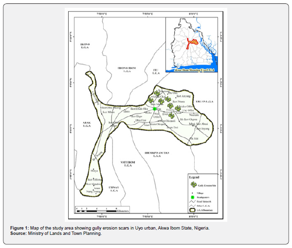 Erosion studies have come to stay because of catastrophic and hazardous ecological deformation lately. Many regions in the world are geomorphologically deformed with ad hoc terrain and rugged topography. The breakdown of geomorphic threshold with vegetation degradation in gully fringes, have shaved away greeny potential that bind the soil drastically [13-20]. The dislodgement of soil is faster were vegetation is scanty with excessive surface runoff. Abraham [1] opined that constant soil detachment with concentrated flow destroy vital soil cover that serve as blanket. Where the vegetation is severely degraded, the potential to bind the soil is limited. In South-Eastern Nigeria, 25,000 hectares of land are lost annually to erosion leaving scars of unprecedented dimension [21-33]. This is seen in unprecedented ecological amputation with dire consequences on environment. The intensification in agriculture and other land uses deprive the soil of vital vegetation. In Uyo urban, the notorious Uyo ravine encroachment hinders meaningful development in the eastern flanks with one sided environmental and socio-economic planning. Greater part of Uyo consists of erosional scars known as ravines. The number of scholars have studied Uyo ravine since 1921 with host communities notably, Anua Offot, Eniong Offot, Ekpri-Nsukara, Ikot Oko Idio, Ewet Offot, Afaha Oku, Ikot Obio Atai. Ikot Obong Edong, Nduetong Oku among others.