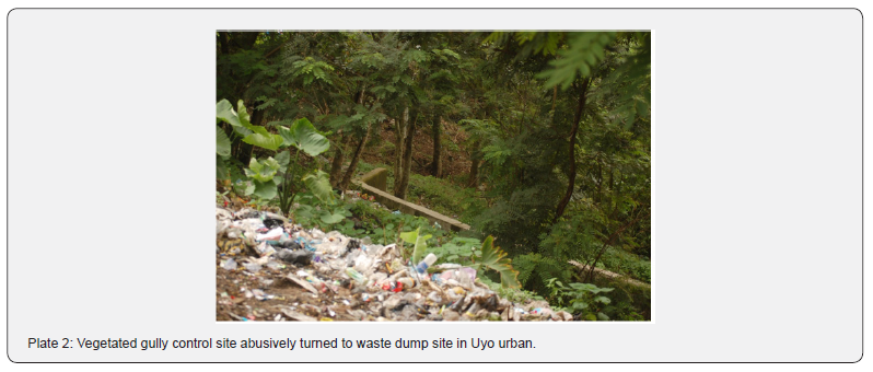 In Plate 1, Eka street gully rehabilitated site, engineering structures is not isolated from biological measures to have success that sustain the environment geomorphologically from degradative scenario occasioned by incessant gully erosion [37].