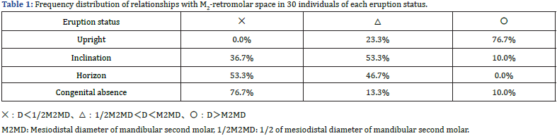 The relationship between eruption status and D-values is shown (Table 1). The most common conditions in each eruption alignment were upright (76.7%: 〇), inclined (53.3%: △) or horizontal (53.3%: ✕) and congenital absence (76.7%: ✕).