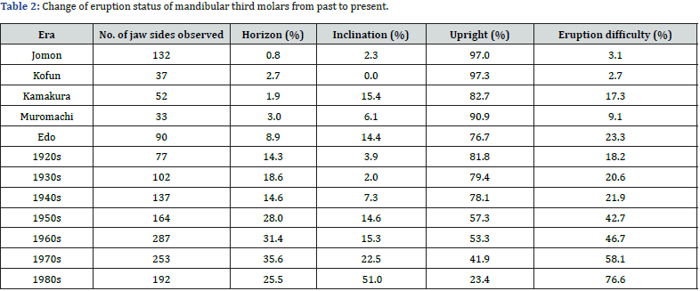 The eruption status of the mandibular third molars depends on the size of the M2-retromolar space, and the smaller the amount of M2-retromolar space, the more the eruption alignment goes from upright to inclined to the horizon. In congenital absence, most of the M2-retromolar space is less than 1/2 of the mesiodistal diameter of the second molar. From the Jomon era until the late 1940s, most mandibular third molars erupted vertically, but after the end of the Second World War, nutrition improved rapidly and the majority of people began to have problems with eruption. The frequency of missing mandibular third molars was low in the Jomon era, but increased rapidly in the Yayoi era, followed by a gradual increase to a peak in the Edo era. It then declined sharply in the 1930s and even more sharply after the 1970s.