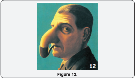 Figure 9 by the German artist Quint Buchholz and Figure 10 describe the sense of taste that allows distinguishing between tasty and delicious when the tongue is the primary organ of taste. This is emphasized in Figure 11 by Magritte due to the additional tongue. And finally the sense of smell that is the ability to distinguish volatile chemicals in air and odours. It is depicted in Figure 12 of Czech Oliver Solga and Figure 13 of the surrealist René Magritte where the picture of Solga emphasizes the fact that the smell eventually absorbed in the brain. Figure 14 is the image of Mona Lisa in which it is possible to distinguish the senses of vision, smell and touch where in Figures 11 & 15 of Einstein all five senses can be observed.