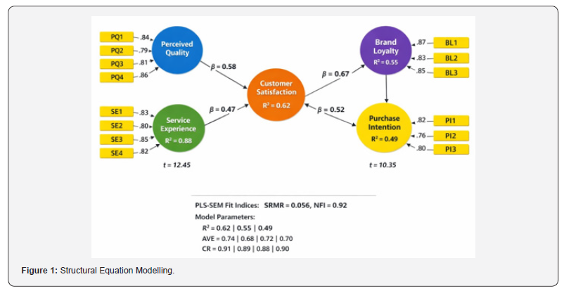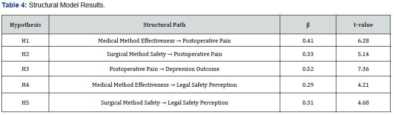 The reliability and validity indicators presented in (Table 3) confirm the robustness of the measurement model. Cronbach’s alpha values range between 0.79 and 0.85, indicating satisfactory internal consistency. Composite reliability values exceed 0.87, suggesting strong reliability across all constructs. Furthermore, the Average Variance Extracted (AVE) values are all above the recommended threshold of 0.50, demonstrating that the constructs explain a substantial portion of the variance of their indicators. These results confirm adequate convergent validity for all latent variables included in the model. The structural model results demonstrate statistically significant relationships between the constructs. Hypothesis H1 proposed that perceptions of medical method effectiveness influence postoperative pain outcomes. The estimated coefficient β = 0.41 indicates a moderate positive relationship, suggesting that the characteristics associated with pharmacological procedures significantly affect postoperative experiences.