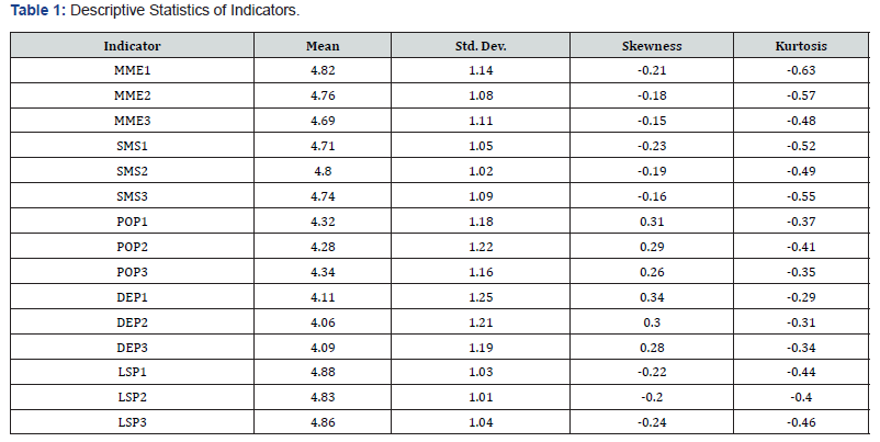 The structural equation model was estimated using the Partial Least Squares (PLS-SEM) approach. The results are presented in terms of the measurement model, structural model, and global model fit indicators. The interpretation of each result is linked to the corresponding research hypotheses. Table 1 presents the descriptive statistics for all reflective indicators included in the model. The means range between 4.06 and 4.88, indicating moderate agreement with the statements measuring the constructs. Standard deviation values show adequate variability across observations. Skewness and kurtosis values fall within acceptable ranges, suggesting that the distribution of responses does not deviate substantially from normality. Although PLS-SEM does not require strict normal distribution assumptions, these statistics indicate that the indicators provide stable measurement properties for estimating the structural relationships proposed in the model. Table 2 shows that all reflective indicators present outer loadings above 0.78, exceeding the recommended threshold of 0.70. These results indicate that each indicator adequately represents its corresponding latent construct. The bootstrapping procedure produced t-values well above the critical value of 1.96, confirming that the indicator loadings are statistically significant. Consequently, the results support the reliability of the measurement model and indicate that the observed variables provide consistent measurement of the underlying constructs