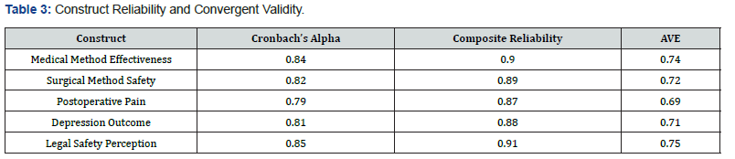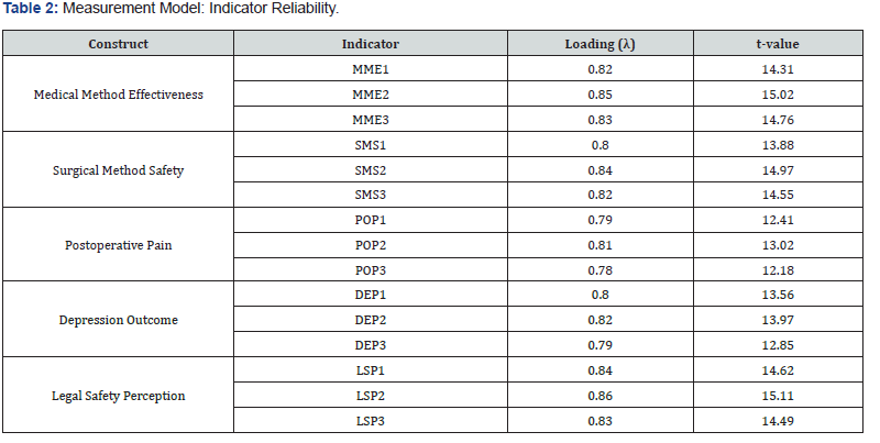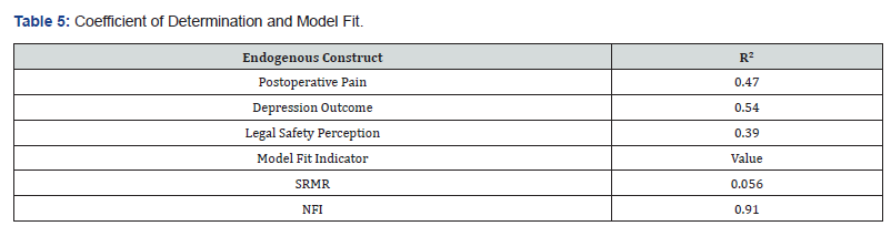 The coefficient of determination values indicates the predictive power of the structural model. The model explains 47% of the variance in postoperative pain, which suggests that clinical procedure characteristics significantly contribute to explaining patients’ postoperative experiences. The model also explains 54% of the variance in depression outcomes, demonstrating that postoperative conditions are strongly associated with psychological responses following the procedure. In addition, 39% of the variance in legal safety perception is explained by the clinical constructs included in the model. The global model fit indicators support the adequacy of the estimated model. The Standardized Root Mean Square Residual (SRMR = 0.056) falls below the recommended threshold of 0.08, indicating a satisfactory level of model fit. Similarly, the Normed Fit Index (NFI = 0.91) suggests that the proposed model provides a good approximation of the observed data structure. The results obtained from the PLS-SEM analysis provide an integrated explanation of the relationships between medical procedures, postoperative experiences, and psychological outcomes in the context of pregnancy interruption. The measurement model demonstrates strong reliability and validity, confirming that the reflective indicators adequately represent their corresponding latent constructs (Figure 1).