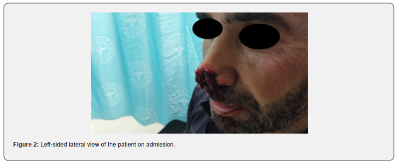 A 34-year-old male with no known comorbidities or regular medication use presented to the emergency department with an actively bleeding nasal tissue defect. He was conscious, and vital signs were within normal limits. The medical history revealed that approximately 30 minutes prior to admission, he had been suddenly bitten on the nose while playing with his mentally impaired relative. Initial management included copious irrigation of the wound with saline solution. No foreign bodies or tooth fragments were identified. Hemostasis was achieved with local pressure. Physical examination demonstrated full-thickness skin loss and partial loss of the lower lateral cartilage involving the nasal tip and right ala, resulting in an approximately 4 × 3 cm soft tissue defect. According to the Rueff classification, the injury was classified as Grade 2 [4]. There were no signs of epistaxis or nasal bone fracture. The patient’s initial clinical appearance is shown in Figure 1 & 2.