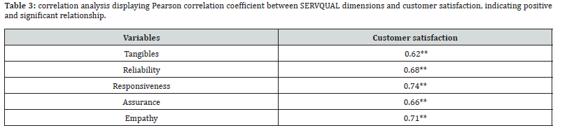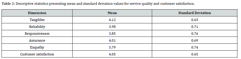 To assess the internal consistency of the measurement Cronbach’s alpha was calculated for all construct. The reliability values for each service quality dimension and customer satisfaction exceeded the acceptable threshold of 0.70 indicating good reliability of the instrument.