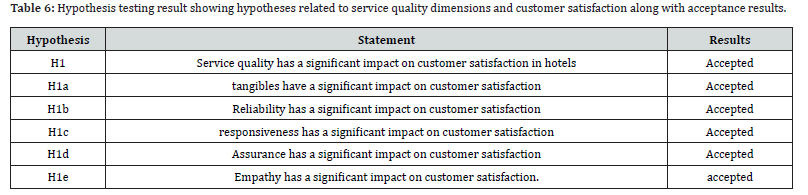 Interpretation: all service quality dimensions show a positive and significant relationship between customer satisfaction, responsiveness and empathy exhibit the strongest correlations, highlighting their importance in shaping guest satisfaction.