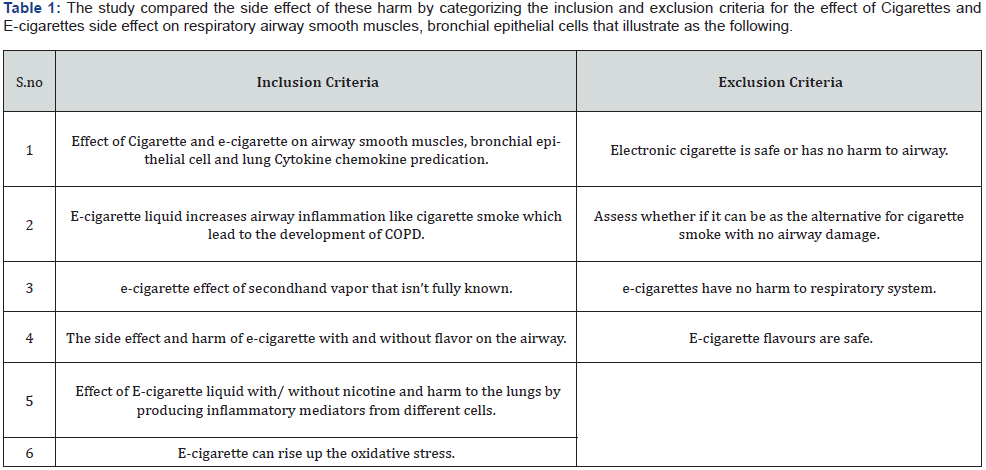 The abstracts were scanned for the relevant search method (effect of cigarette and e-cigarette on airway smooth muscle and normal bronchial epithelial cells. Containing data from a clinical trial on the prevalence effect of cigarette and e-cigarette on airway smooth muscles and bronchial epithelial cells. In the search scan the points were focusing on effect of Cigarette and e-cigarette on airway smooth muscles, bronchial epithelial cell and lung Cytokine chemokine predication. Also, assess E-cigarette liquid if it can increase airway inflammation like cigarette smoke which lead to the development of COPD. Moreover, in this method, the focus of the harm e-cigarette effect of secondhand vapor and compare it to cigarette smoke. Most importantly, in this literature search is to find out the side effect and harm of e-cigarette with/without (flavor- nicotine) on the human airways. It has been noticing that multiple types of the flavor of E-cigarette that can be vaping and need to find out if it safe on the respiratory airway smooth muscles, bronchial epithelial cells. The study compared the side effect of these harm by categorizing the inclusion and exclusion criteria for the effect of Cigarettes and E-cigarettes side effect on respiratory airway smooth muscles, bronchial epithelial cells that illustrate as the following (Table 1).
