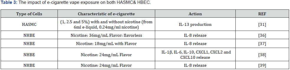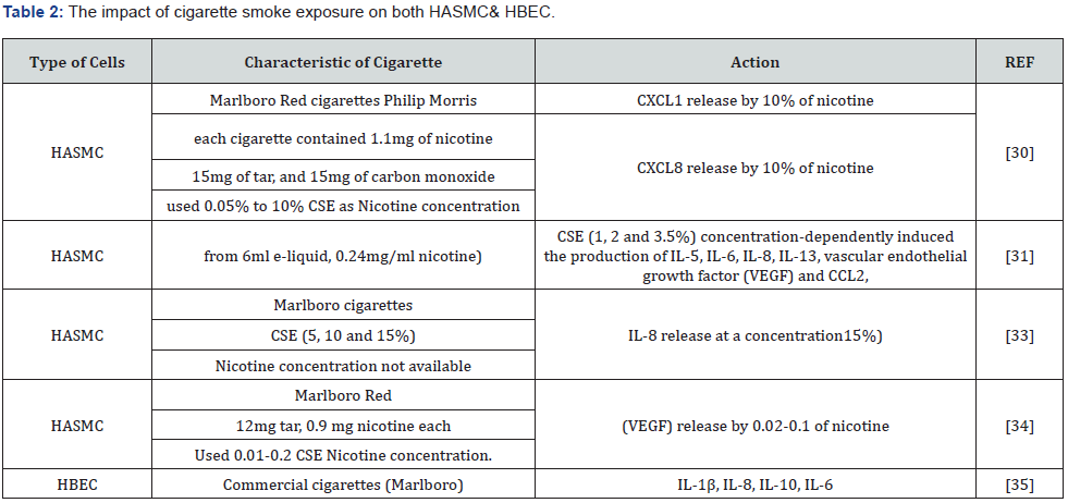 The cigarette smoke CSE increased the release of CXCL8 and CXCL1 from human airway smooth macules cells, and cells from smokers with COPD produced more CSE-induced CXCL1 [30]. Others demonstrated the effect of cigarette smoke on airway smooth muscles cells. CSE (1,2 and 3.5%) induced the production of IL-5, IL-6, IL-8, IL-13, vascular endothelial growth factor (VEGF) and CCL2, but not CXCL-10 and RANTES [31]. Unlike the e-cigarette without nicotine (from 6ml e-liquid, 0.24mg/ml nicotine) was using the e-liquid on the HASMC as the following percentage (1, 2.5 and 5%) which only significantly induced the production of IL-13 from HASMC [31]. Whereas the impact of exposure to e-cigarette vapor Nicotine: 24 mg/mL on NHBE cells induced cell viability and rise up the oxidative stress [32]. Therefore, e-cigarette showed toxicity to the cells and cannot be a good method of smoking cessation as it contributes to the rising up of oxidative stress (Table 2 & 3) [33-39].