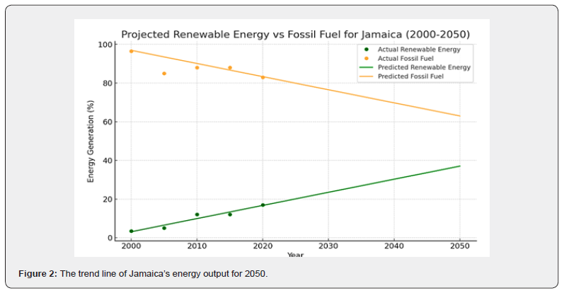 The projected trend in Jamaica’s renewable energy generation, as illustrated in Figure 2, underscores the country’s gradual but consistent shift towards sustainable energy sources. The data utilized for the generation of the regression are employed from various sources, including Country economy.com (2001), the International Renewable Energy Agency (2024), the United Nations Economic Commission for Latin America (UNECLAC) via Loy & Coviello (2005), and the World Bank (2019) [17-20]. This shift is influenced by various factors, including the robust policy framework established by the National Energy Policy of 2009 and subsequent legislation like the Electricity Act of 2015. These policies have provided the necessary incentives and regulatory frameworks to foster an environment conducive to renewable energy development. The adoption of renewable energy in Jamaica is also driven by economic factors, particularly the volatility of oil prices and the decreasing costs of renewable technologies. As renewable energy becomes more economically viable, its adoption will likely accelerate, contributing to a diversified energy mix that reduces the country’s dependence on fossil fuels.