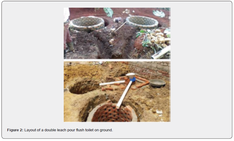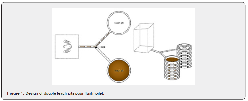 The double leach pour-flush toilets are improved pit latrines, which allow on-site treatment and transformation of feacal sludge into a hygienized soil amendment. They consist of two pits, linked with a Y-junction to a single pour flush toilet. Often pits are placed symmetrically at the back of the latrine in order to have good access and ensure drainage from the user interface to the pits (Figure 1).
