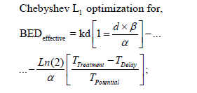 The BED model algorithm that was selected is the standard one of the first generation. For hyperfractionation as a first step research choice [25,83]. The numerical difference has not been checked implementing further generations of BED algorithms. However, as a tentative calculus given the numerical data obtained, it seems that the numerical differences could not differ significantly from the first-generation model function. The L1 norm selected (Tikhonov L1 norm) was applied for programming simplification. In previous articles, it was found that software implementation of (Tikhonov L2) norm did not show substantial differences with L1 norm. Besides, the design of the program for L2 norm results be more complicated and does not bring important variances. Other features that the implementation of the L2 norm implies a longer running time, which is an added difficulty. First simulation shows higher number of fractions, and lower magnitude of dose per fraction than the second simulation, Table 5 & 6.