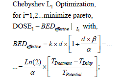 Second Step: Setting This Model In L1 Objective Function: Therefore, the Pareto-Multi objective Optimization basic BED Effective created in this contribution algorithm-model was set in software, [91]. Parameters are detailed in Algorithm 1 [85-91]. Two different PMO optimization programming series are presented with different parameter intervals magnitudes, Table 1 & 2. This BED model constitutes the fundamentals for fractionate radiotherapy, although there are variations among authors [22-25]. Formulation is based on previous studies computational software [1-21,85-91]. The algorithm that was set, with Chebyshev L1 norm, [Algorithm 1], reads,
